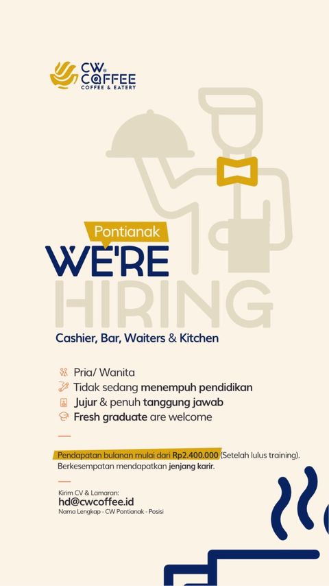 Yogyakarta, We’re Hiring Cashier, Bar, Waiters & Kitchen Pria / Wanita Tidak sedang menempuh pendidikan Jujur & penuh…