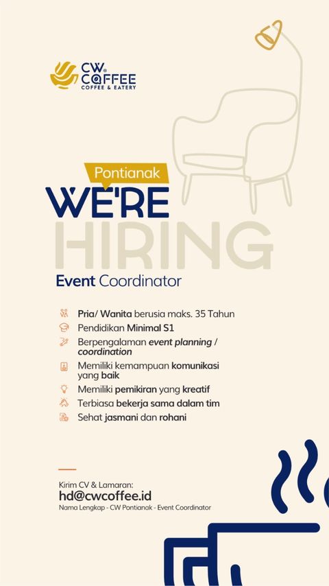 Pontianak, We’re Hiring Event Coordinator Pria / Wanita berusia maks. 35 Tahun Pendidikan Minimal S1 Berpengalaman event planning…