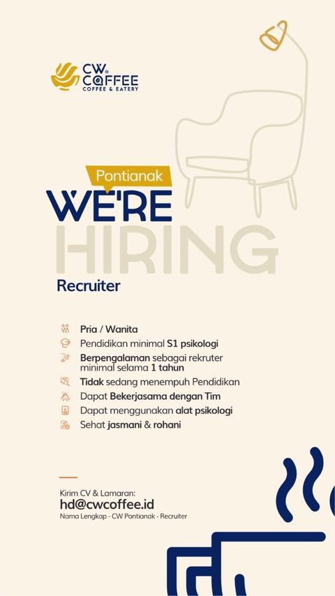 Pontianak, We’re Hiring Recruiter Pria / Wanita Pendidikan minimal S1 psikologi Berpengalaman sebagai rekruter minimal selama 1 tahun…