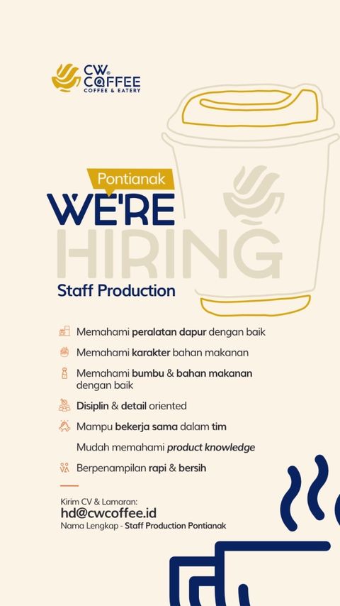Pontianak, We’re Hiring Staff Production Memahami peralatan dapur dengan baik Memahami karakter bahan makanan Memahami bumbu & bahan…